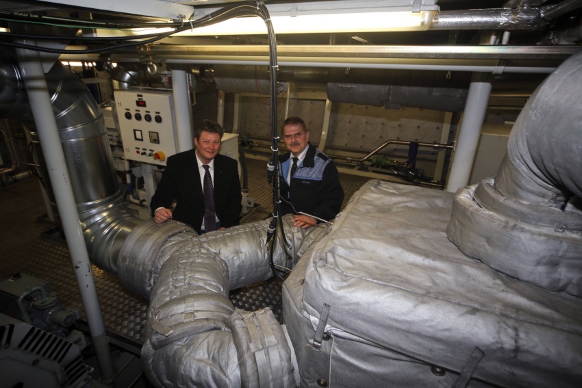 Fünf Fähren der Schiffsverbindung Konstanz-Meersburg wurden mit modernen Abgasreinigungs-Anlagen ausgerüstet. Fähre-Geschäftsbereichsleiter Stefan Ballier (links) und Technikleiter Hans-Dieter May zeigen die Filteranlagen im Maschinenraum der „Lodi".