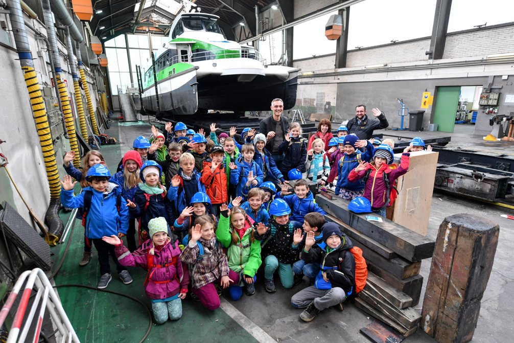 Die Klassen 2b und 2c der Wallgutschule in Konstanz besuchten auf Einladung der Katamaran-Reederei das flotte Schiff auf der Werft in